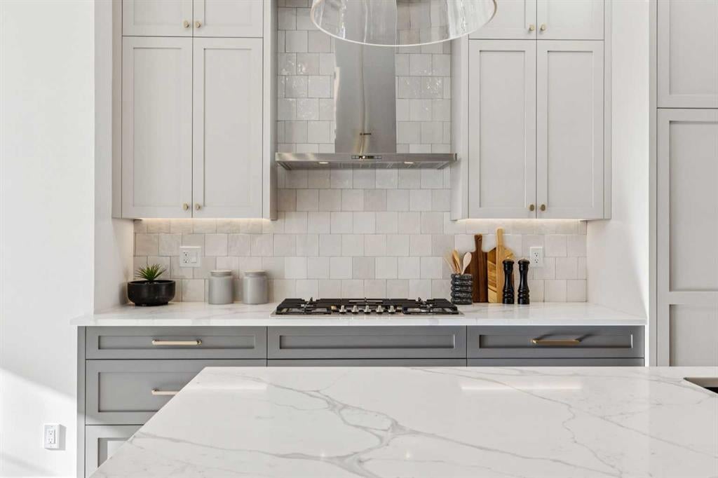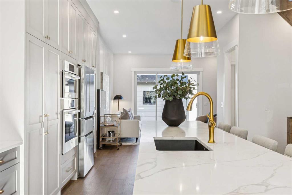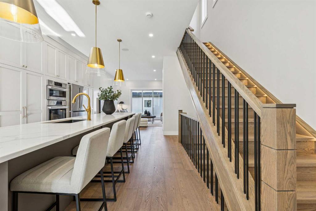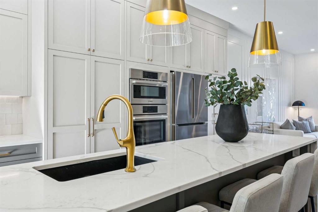 2. THAT KITCHEN! Proof that a contemporary home can be warm & inviting. This kitchen is a showstopper & truly a space designed for gathering & creating memories. Anchored by a 14’ quartz waterfall island, integrated Bosch appliance package, full height cabinet w/spice cupboard, oversize pendant + undermount lighting. Whether preparing a feast, hosting a dinner party or simply warming up takeout you will feel right at home here.